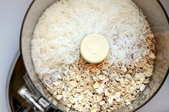 In the bowl of a food processor, combine the oats and coconut. Process until finely ground, about 1 minute. Add the flour, cream of tartar, baking soda and salt and pulse to blend. Transfer the dry ingredients to a large bowl.