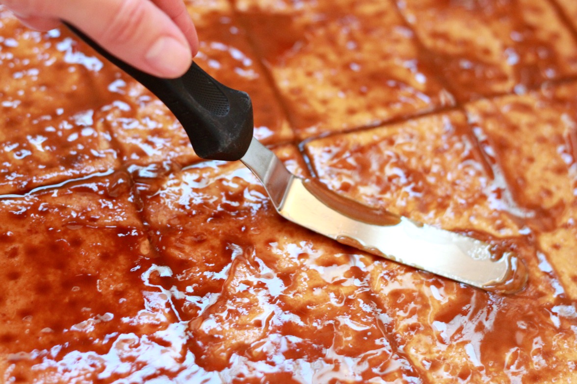 Pour the caramel evenly over the crackers. Use an offset spatula to quickly smooth the caramel over the surface. Sprinkle generously with the almonds. Bake until bubbly, 8 to 10 minutes, rotating the baking sheets halfway through baking time. Cool completely on a wire rack before breaking into pieces.