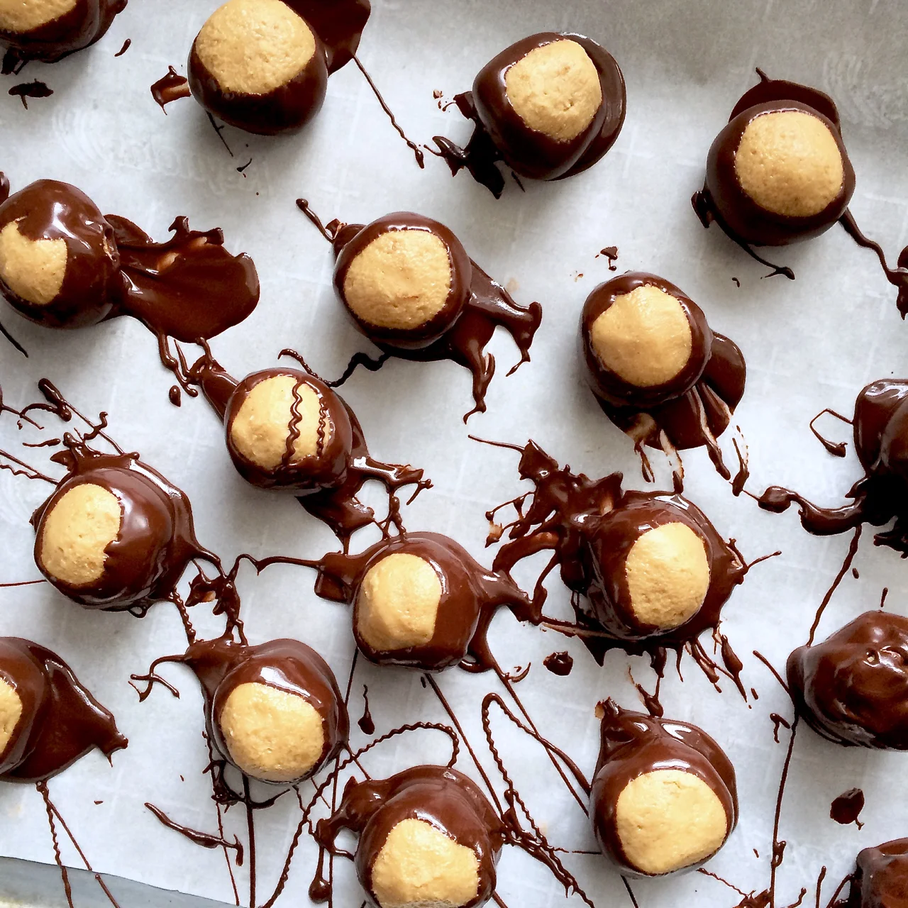 To finish the buckeyes, line a sheet pan with parchment paper or a silicone baking mat. Use a small ice cream scoop or two spoons to portion out level tablespoons of filling and use your palms to roll the portions into balls.